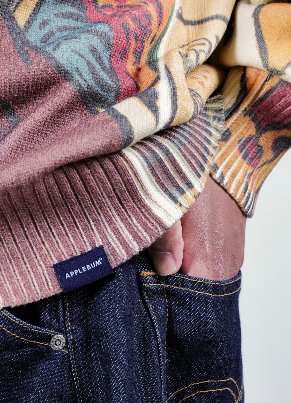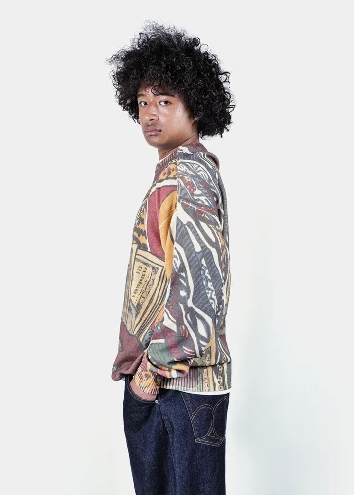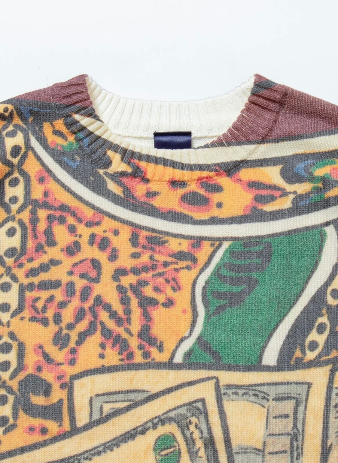 アーティスト濱口健氏が書き下ろした、伝説的ラッパーBIGが生前愛用していたジャガード柄セーターへのオマージュアートを全面にプリントしたニットセーター。