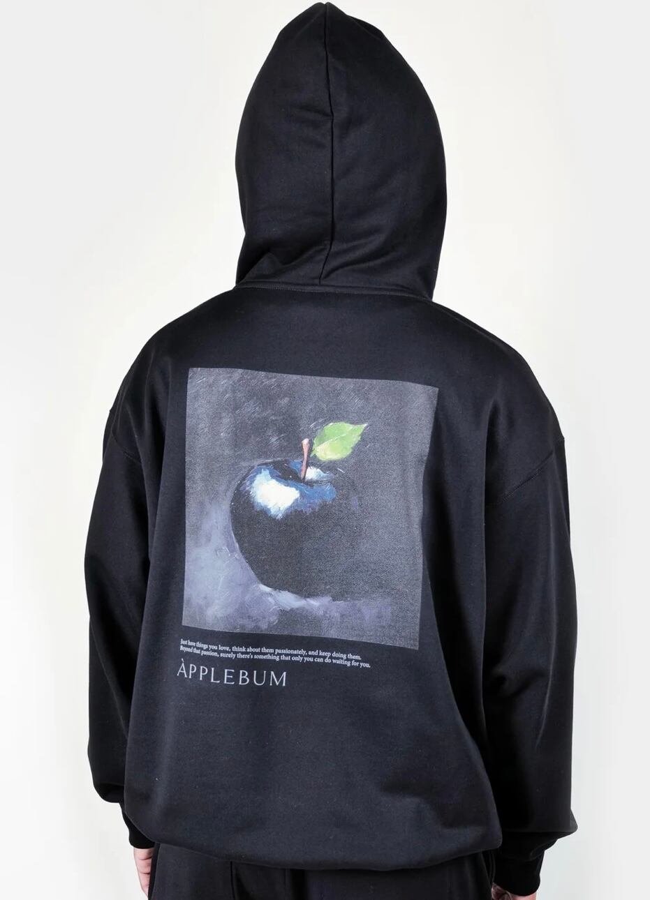 黒い林檎を描いた油絵を大胆にデザインしたスウェットパーカー。