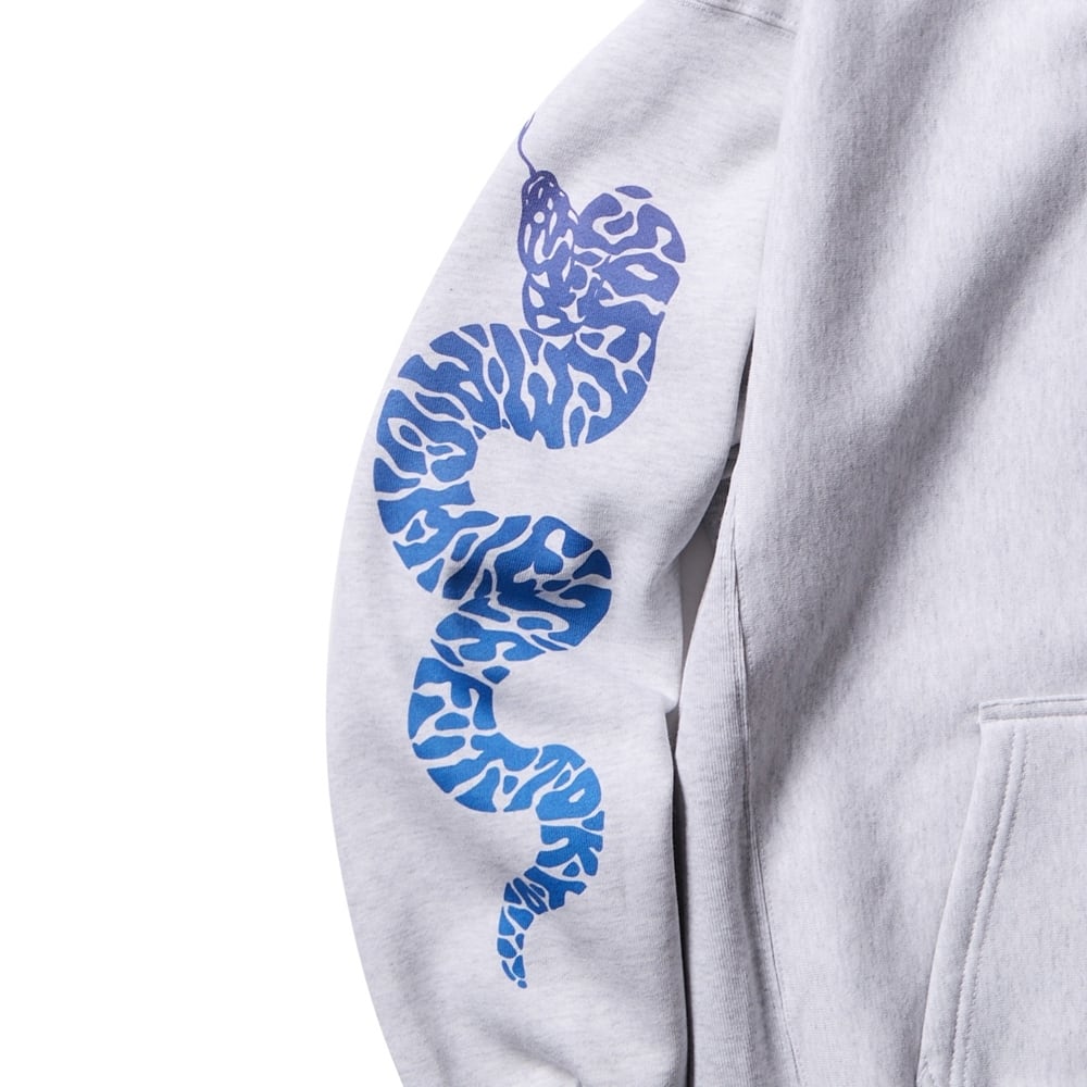 サイケデリックなデザインを両袖に施したフーディ。ボディーは裏起毛で保温性に優れた着心地、秋冬に活躍する1枚です。