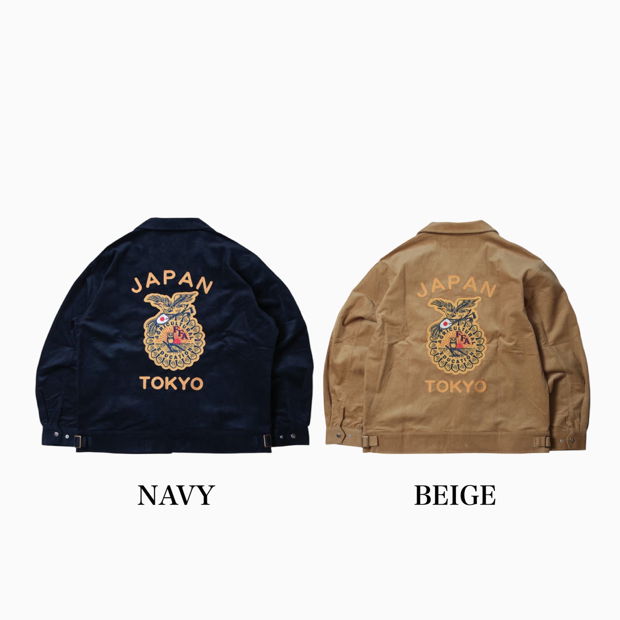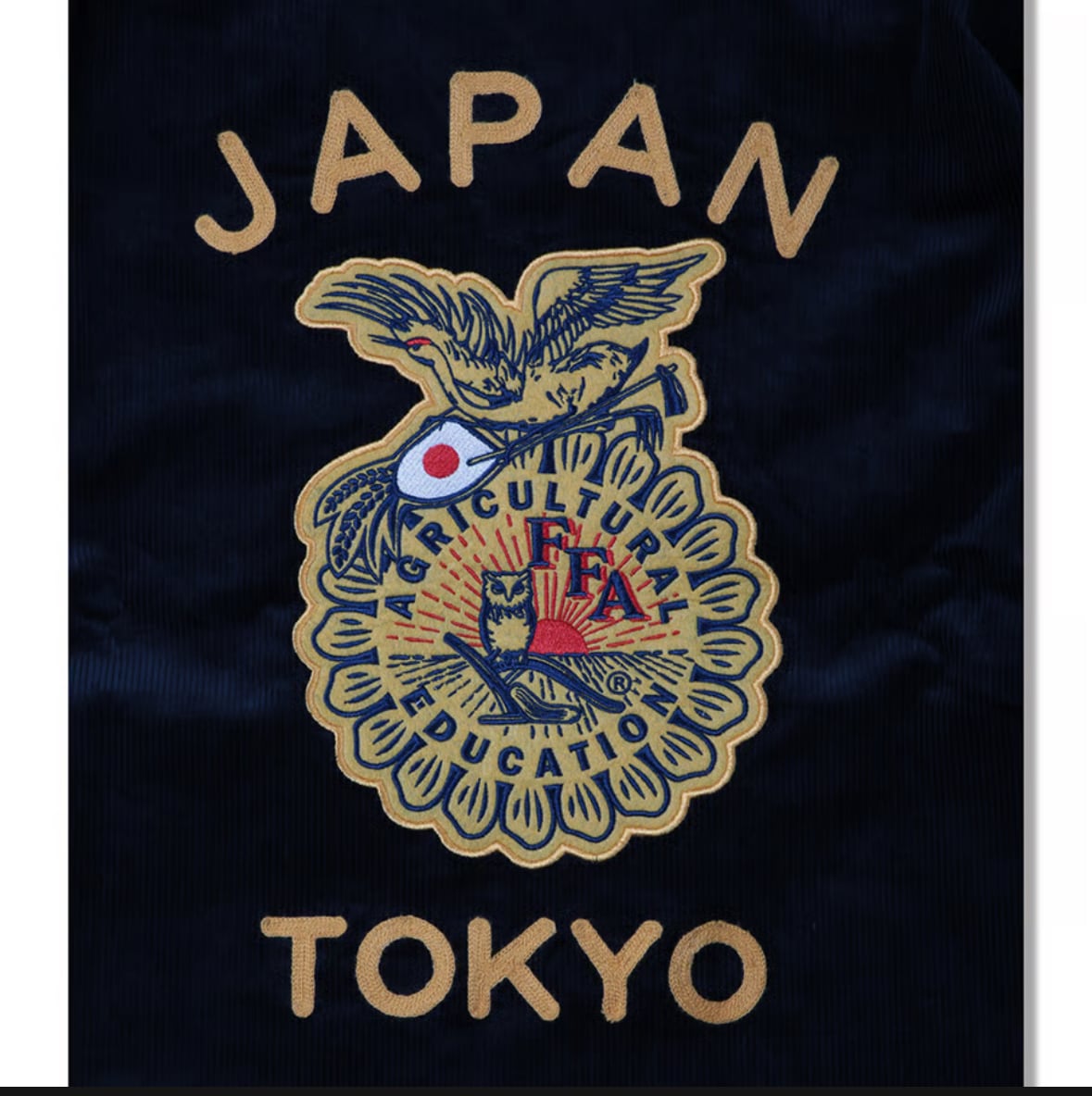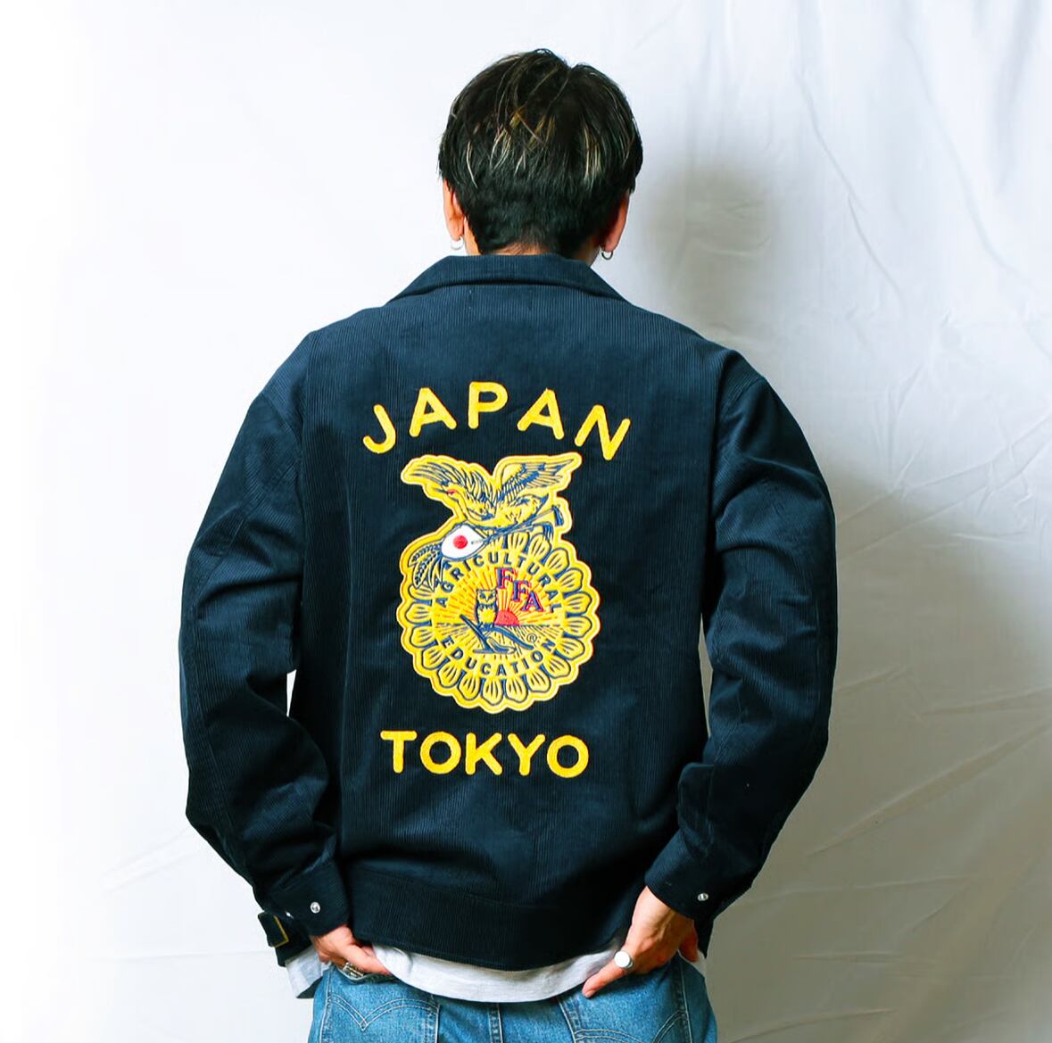 チェーンステッチにて表現したANIMALIA、JAPAN&TOKYO刺繍、そしてフロントバックに大小のワッペンが付いたモデル。