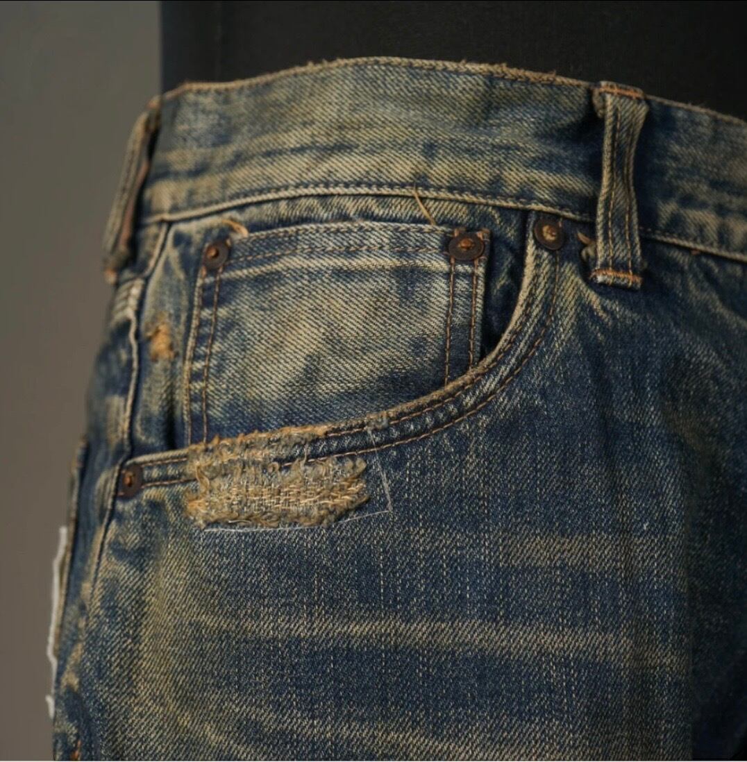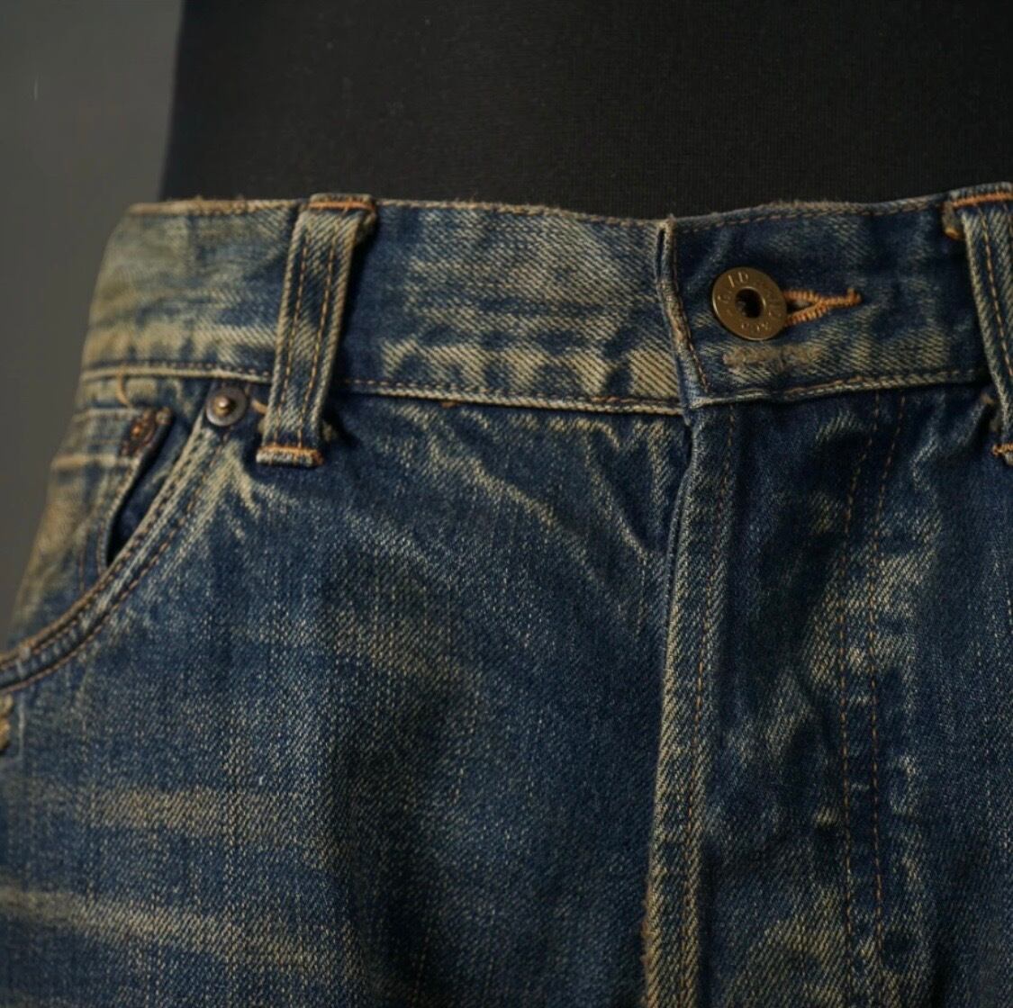 経糸と緯糸で番手を変えることにより、絶妙なムラ感を表現したデニムを採用。股ぐりやバックヨークなど負担のかかりやすい部分をトリプルステッチで仕上げた堅実な作りと、バックポケットのクロスカンヌキが特徴。