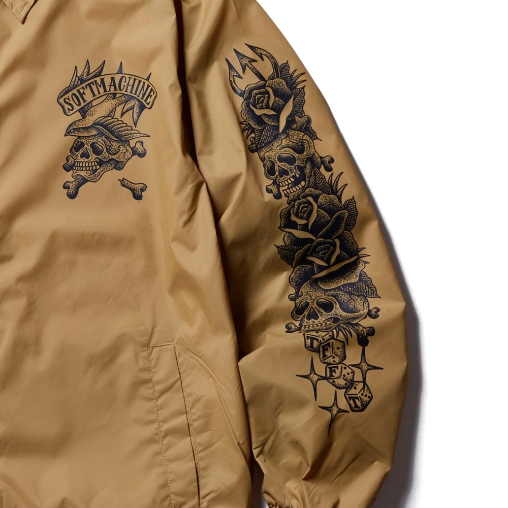 落ち着いたベージュカラーのボディに、胸と袖にはインパクトのあるトーテムスカルグラフィックのSOFTMACHINEらしい世界観を落とし込んだコーチジャケット。