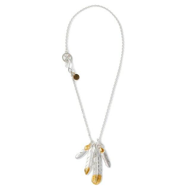 フェザーモチーフのネックレス。ネイティブ感のあるデザインが着こなしのアクセントになります。シンプルな着こなしでも、装着するだけで充分存在感を発揮してくれるアイテムです。