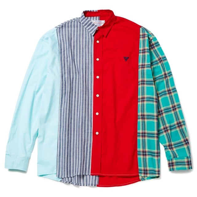 4種類の異なる柄の生地を組み合わせ、絶妙なサイジングで仕上げたオーバーシルエットデザインのロングスリーブシャツ。ドロップショルダー仕様にするなど、今のストリートスタイルに欠かせないトレンド性の高いアイテムです。