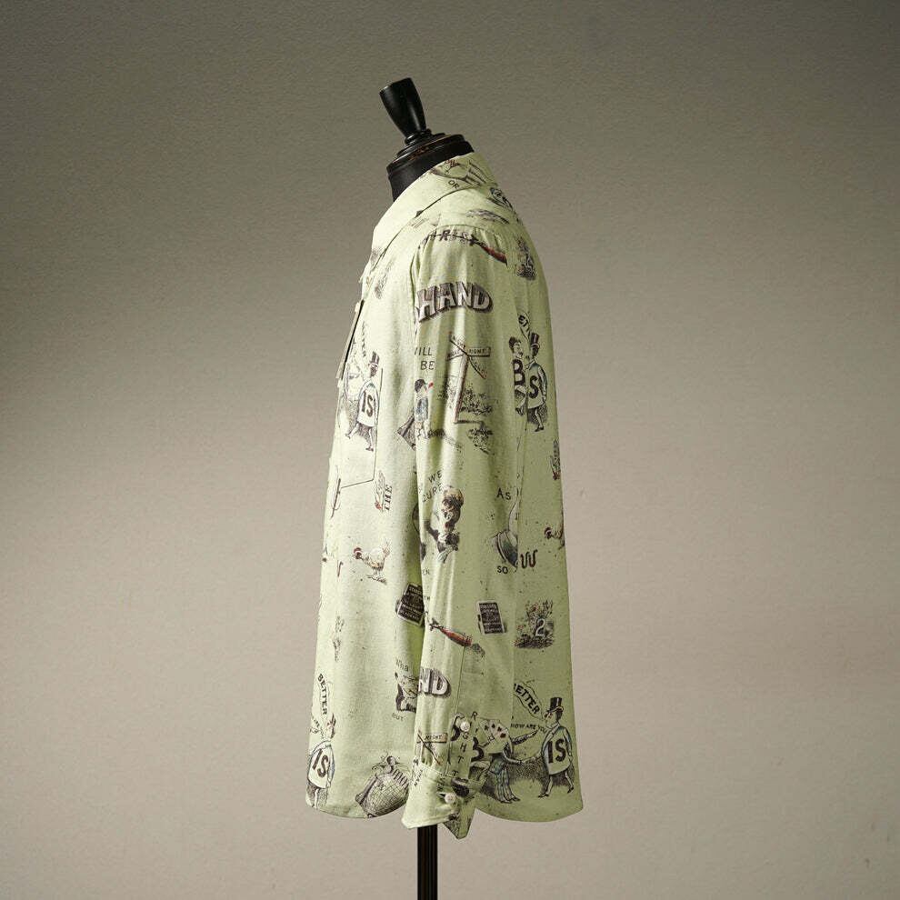 レーヨンの光沢感とリネンのシャリ感があるキャンバス素材にインクジェットで繊細な柄を施しました。1880年頃のREBUSパズルからインスパイアされたBY GLADHANDならではのグラフィック